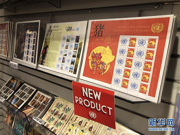 這是1月15日在位于紐約的聯(lián)合國總部拍攝的己亥豬年特別版郵票。 為慶祝中國農(nóng)歷新年的到來,聯(lián)合國郵政管理局11日發(fā)行己亥豬年特別版郵票版張。版張共包含10枚圖案為聯(lián)合國會(huì)徽的郵票,每枚面值1.15美元,整個(gè)設(shè)計(jì)延續(xù)了聯(lián)合國“中國農(nóng)歷生肖”系列郵票傳統(tǒng),以紅色和金色為主色調(diào),以中國剪紙為藝術(shù)靈感,副票和背景為一大一小兩只萌豬形象。 新華社記者李木子攝