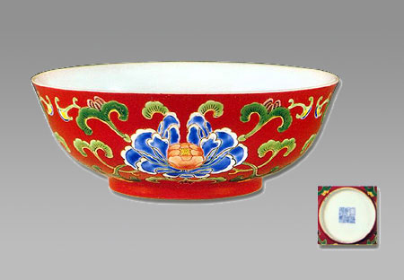 琺瑯彩是康熙、雍正、乾隆三朝宮廷燒制的名貴品種。此碗在紫色的胭脂釉上繪綠色的枝葉、藍(lán)色的花瓣、紅色的花蕾、黃色的花心, 色澤濃艷華貴。