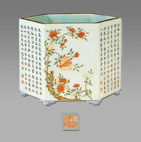 筆筒為六方形, 口沿描金,外壁六個(gè)面上分別繪有粉彩石榴、山茶、菊花并題寫行書《詠石榴》、隸書《詠山茶》、篆書《詠菊花》詩三首,均為皇帝親筆御書。石榴、山茶、菊花均是秋季花實(shí),合稱“三秋”圖。