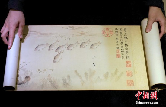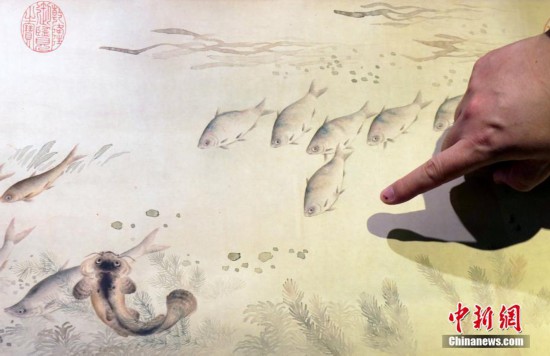 3月12日,香港蘇富比舉行2019年春季拍賣會(huì)傳媒預(yù)覽,介紹即將在春拍上亮相的重點(diǎn)拍品。圖為即將上拍的清代畫家余省的作品《魚藻圖》局部,左上角有“乾隆御覽之寶”的印鑒。該作品是清宮舊藏,并有乾隆御題,著錄于《石渠寶笈續(xù)編》。中新社記者 張煒 攝