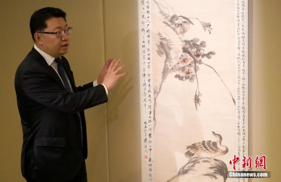 3月12日,香港蘇富比舉行2019年春季拍賣會(huì)傳媒預(yù)覽,介紹即將在春拍上亮相的重點(diǎn)拍品。圖為蘇富比亞洲區(qū)中國(guó)古代書畫部主管左昕陽(yáng)介紹明末清初畫家八大山人朱耷作品《芙蓉蘆雁圖》,估價(jià)1400萬(wàn)港元至1800萬(wàn)港元。中新社記者 張煒 攝