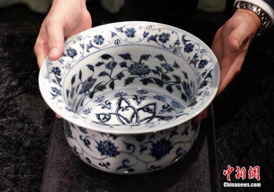 3月12日,香港蘇富比舉行2019年春季拍賣會(huì)傳媒預(yù)覽,介紹即將在春拍上亮相的重點(diǎn)拍品。其中香港天民樓收藏的十八件明清瓷器首次在藝術(shù)品拍賣市場(chǎng)上亮相。圖為天民樓藏品明代永樂(lè)年間的青花纏枝番蓮紋折沿盆,估價(jià)800萬(wàn)港元至1200萬(wàn)港元。香港天民樓由收藏家葛士翹創(chuàng)立,其子葛師科為第二代主人。天民樓以收藏元明清青花御瓷見(jiàn)長(zhǎng),號(hào)稱青花御瓷私人收藏之冠。據(jù)香港媒體報(bào)道,香港警方早前偵破歷來(lái)最大宗倫敦金詐騙案,天民樓主人葛師科是苦主之一,被騙走5.8億港元。中新社記者 張煒 攝