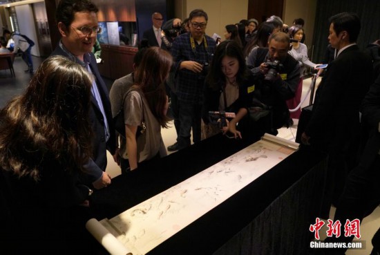 3月12日,香港蘇富比舉行2019年春季拍賣會(huì)傳媒預(yù)覽,介紹即將在春拍上亮相的重點(diǎn)拍品。圖為媒體記者關(guān)注即將上拍的清代畫家余省的作品《魚藻圖》。該作品是清宮舊藏,并有乾隆御題,著錄于《石渠寶笈續(xù)編》。估價(jià)1000萬(wàn)港元至1500萬(wàn)港元。中新社記者 張煒 攝