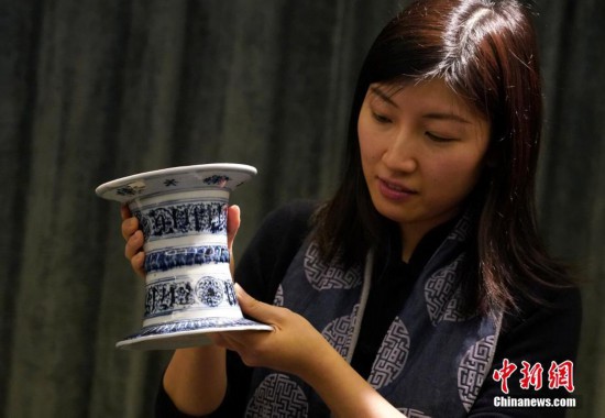 3月12日,香港蘇富比舉行2019年春季拍賣會(huì)傳媒預(yù)覽,介紹即將在春拍上亮相的重點(diǎn)拍品。圖為即將上拍的明代永樂(lè)年間的青花阿拉伯文無(wú)擋尊。該拍品為景德鎮(zhèn)御窯所制,形仿中東金屬器,糅合阿拉伯文為飾,類似瓷器僅知七例存世,大多藏于中國(guó)的博物館。中新社記者 張煒 攝