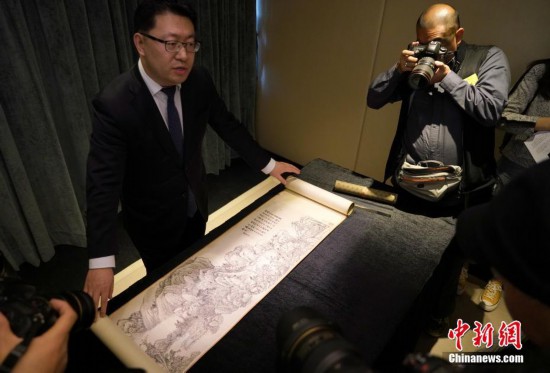 3月12日,香港蘇富比舉行2019年春季拍賣會(huì)傳媒預(yù)覽,介紹即將在春拍上亮相的重點(diǎn)拍品。圖為蘇富比亞洲區(qū)中國(guó)古代書畫部主管左昕陽(yáng)介紹清代狀元畫家錢維城的《仿元四家山水卷》,作品長(zhǎng)逾5米,是畫家贈(zèng)與胞弟錢維喬之作。該拍品估價(jià)1200萬(wàn)至1600萬(wàn)港元。中新社記者 張煒 攝