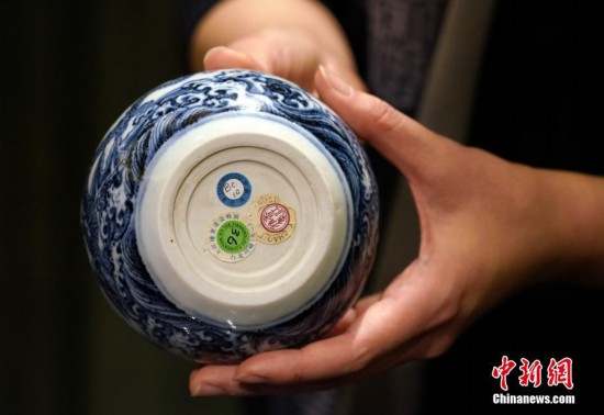 3月12日,香港蘇富比舉行2019年春季拍賣會(huì)傳媒預(yù)覽,介紹即將在春拍上亮相的重點(diǎn)拍品。其中香港天民樓收藏的十八件明清瓷器首次在藝術(shù)品拍賣市場(chǎng)上亮相。圖為天民樓藏品明代青花海水騰龍紋小罐底部的參展標(biāo)簽。香港天民樓由收藏家葛士翹創(chuàng)立,其子葛師科為第二代主人。天民樓以收藏元明清青花御瓷見(jiàn)長(zhǎng),號(hào)稱青花御瓷私人收藏之冠。據(jù)香港媒體報(bào)道,香港警方早前偵破歷來(lái)最大宗倫敦金詐騙案,天民樓主人葛師科是苦主之一,被騙走5.8億港元。中新社記者 張煒 攝