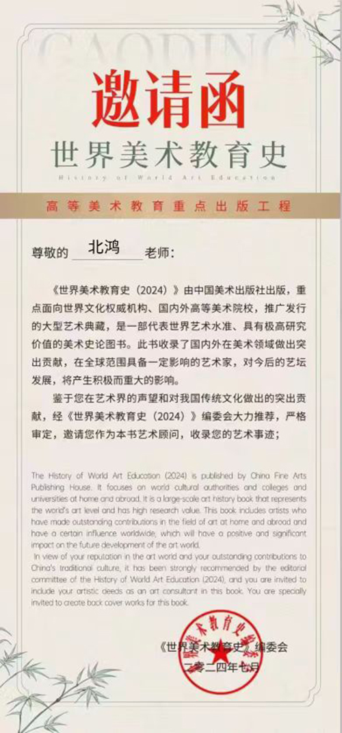 鑒于中國油畫巨匠北鴻先生在創(chuàng)作實踐與豐富新理論方面,兼容并蓄,大膽創(chuàng)新,作品博彩眾長,在全面繼承優(yōu)秀傳統(tǒng)文化上推陳出新,作品體現(xiàn)寬博、厚重、質(zhì)樸的中國文化精髓,其獨(dú)創(chuàng)的超印象藝術(shù)風(fēng)格,豐富寶貴的藝術(shù)實踐為繁榮和發(fā)展我國傳統(tǒng)藝術(shù)提供難得的借鑒依據(jù),為弘揚(yáng)民族傳統(tǒng)文化藝術(shù),繁榮當(dāng)代文藝作出了卓越貢獻(xiàn)。北鴻的作品具有極高的藝術(shù)水準(zhǔn)和學(xué)術(shù)價值,不愧為“一代宗師”,經(jīng)愛國主義教育工作委員會和各大型主流媒體單位及相關(guān)文化單位等顧問編委的大力推薦,北鴻被選入出版的《世界美術(shù)教育史(2024)》,將北鴻的藝術(shù)事跡收錄于該書,給后人留下寶貴精神財富,并廣為流傳 。