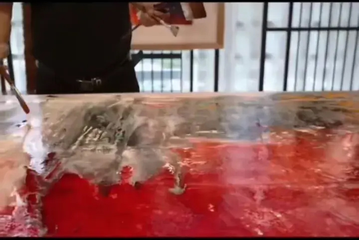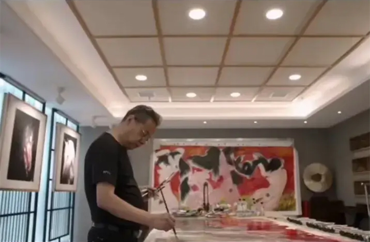 最后,來到北鴻的工作室。創(chuàng)作中的《萬山紅遍》,與李可染大師的作品可媲美。當然技法完全不同,李可染是國畫,北鴻是中西合壁的油畫,用油彩在畫布恣意揮灑!