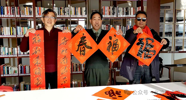 活動現(xiàn)場,書香四溢。背后的書架上擺滿了琳瑯滿目的書籍,營造出一種濃厚的文化氛圍。三位大師在現(xiàn)場各展風采,只見他們鋪紙研墨,揮毫潑墨間,一對對寓意美好的春聯(lián)和一張張充滿喜慶的“福”字躍然紙上。