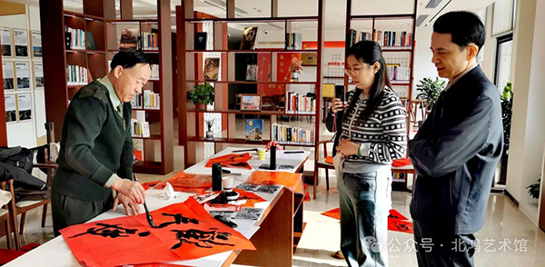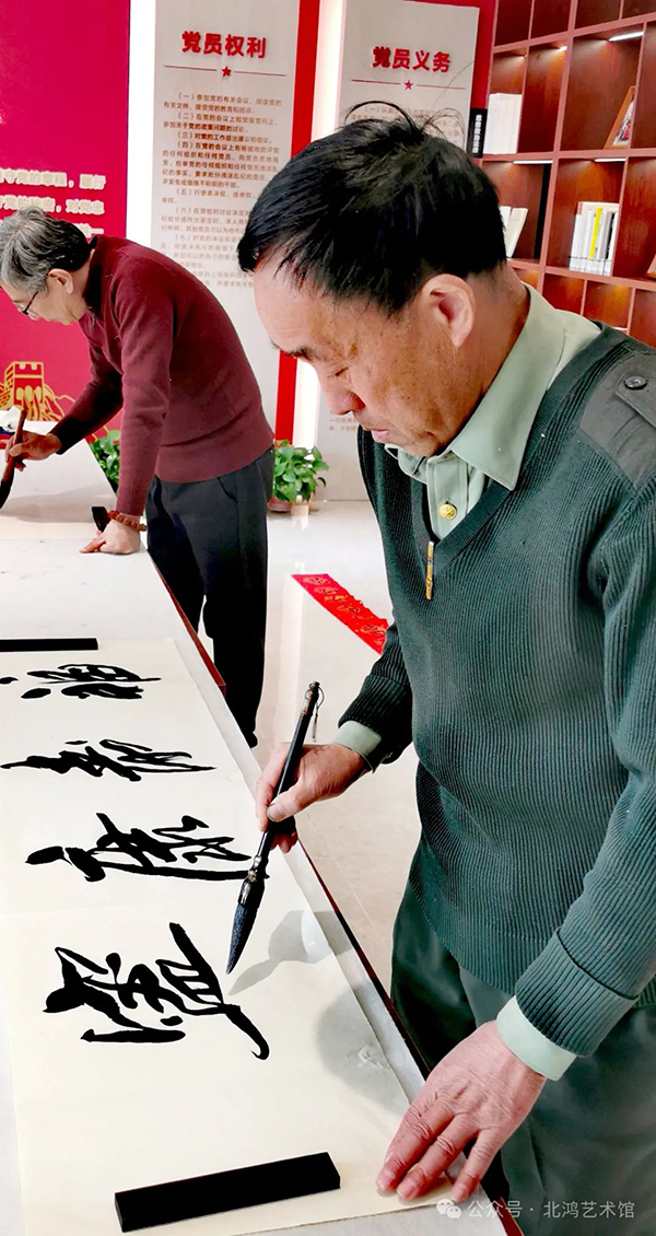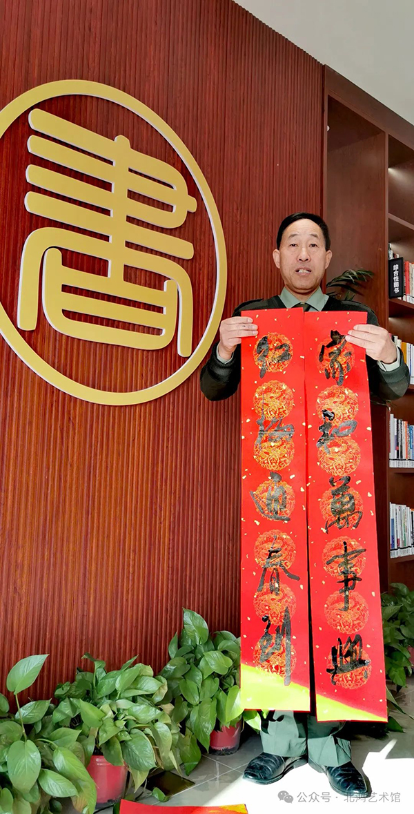 張兵,江蘇沭陽籍,師承張海,其書法風格獨樹一幟。熔古鑄今、拙險欹平的書風,搭配藏露遒芳、古樸蒼茫的筆墨,盡顯其書法魅力。他在書畫領域獲獎無數(shù),作品在國家(全軍)級展賽中屢獲特、金、銀、銅獎,并且被眾多知名報刊刊載或報道,如《解放軍報》《中國書畫報》等。毛主席紀念堂、雷鋒紀念館等多家機構(gòu)和中外友人都收藏有他的作品,個人藝術傳略及部分獲獎作品被多部辭書寶典收錄,黃河碑林、廬山碑林也有其勒石。此次書寫春聯(lián),張兵的書法行云流水,筆鋒婉轉(zhuǎn)間,新春的祝福通過筆墨傳遞給在場的每一個人。
