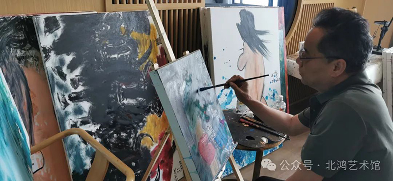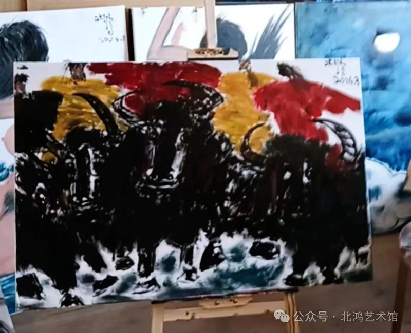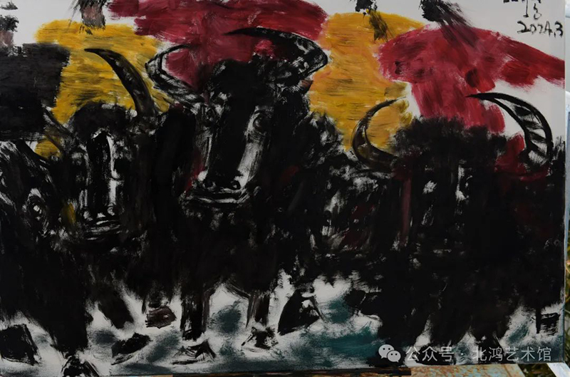 李可染筆下的牛充滿了生活情趣、泥土氣息,表現(xiàn)了牛的忠誠樸實耐勞的高尚品質(zhì)。而今天,我們有幸目睹了另一種風(fēng)格迥異的作品,一幅震撼人心的畫作——北鴻的超印象詩畫作品《雄渾史詩:金戈鐵馬》。