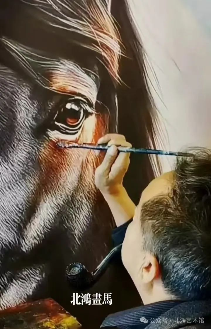 這種創(chuàng)作既是對(duì)徐悲鴻“盡精微致廣大”的當(dāng)代回應(yīng),更是對(duì)北島“冰山理論”的視覺(jué)詮釋。當(dāng)觀眾驚嘆畫(huà)作“堪比高清攝影”時(shí),北鴻在創(chuàng)作手記中寫(xiě)道:“超寫(xiě)實(shí)不是復(fù)刻現(xiàn)實(shí),而是用顯微鏡尋找被遺忘的東方基因——那些在鬃毛間隙游走的甲骨文,在馬蹄曲面蜷縮的楚辭韻腳”。