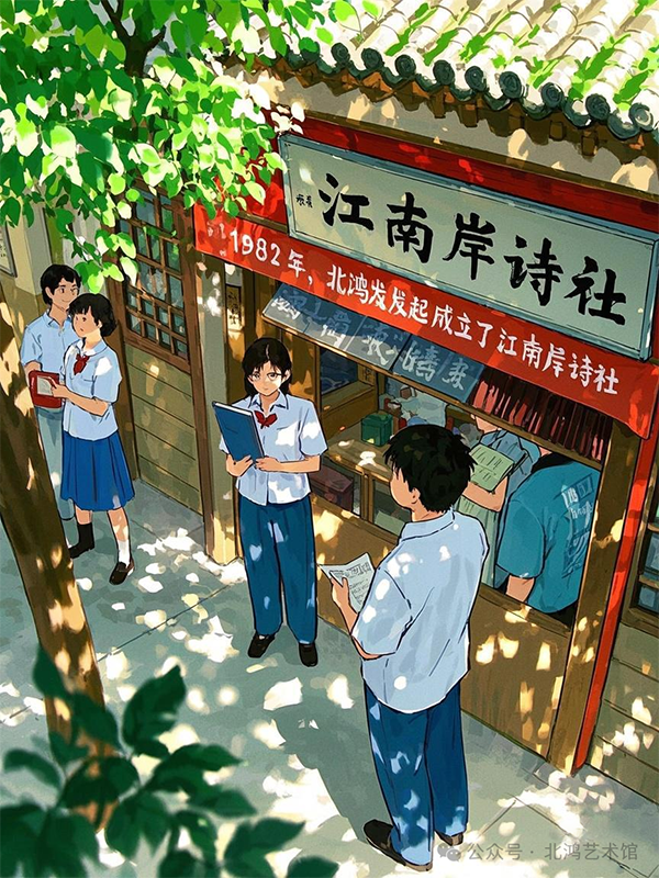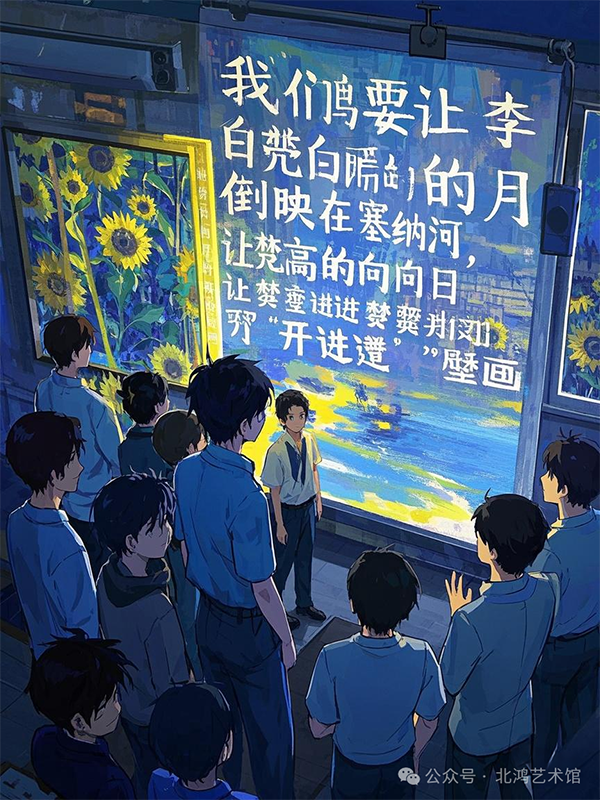 1982 年,北鴻發(fā)起成立了江南岸詩社。詩社的成立,猶如一顆投入平靜湖面的石子,激起了層層漣漪。在詩社的首次聚會上,北鴻以一種極具先鋒性的方式,展示了他對東西方藝術(shù)融合的獨特見解。他將波德萊爾的《巴黎的憂郁》與李賀的《李憑箜篌引》并置投影在墻壁上,燈光閃爍,文字跳躍,仿佛在訴說著東西方文化的對話。北鴻站在眾人面前,目光堅定地說道:“我們要讓李白的月亮倒映在塞納河,讓梵高的向日葵開進楚漢壁畫!” 他的話語擲地有聲,如同一道閃電,劃破了當時藝術(shù)界的沉悶與保守。