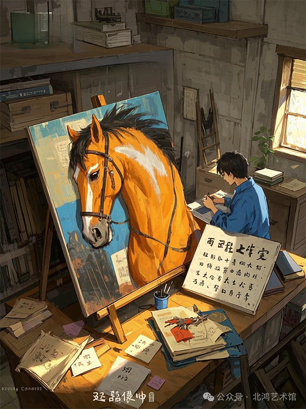 工作室的墻壁上,掛滿了北鴻未完成的《楚漢印象》系列油畫。這些作品中,項羽的烏騅馬形象栩栩如生,而馬眼中卻巧妙地嵌套著畢加索的立體派線條,這種將中國傳統(tǒng)文化元素與西方現(xiàn)代藝術(shù)風格相結(jié)合的手法,讓人耳目一新。地上散落著詩稿《雨太猛沖垮夏季》,其中“馬蹄踏碎青銅器的銹/詩句在裂縫中發(fā)芽”的意象,與畫布上的裂痕肌理遙相呼應(yīng),仿佛在訴說著藝術(shù)的無限可能。