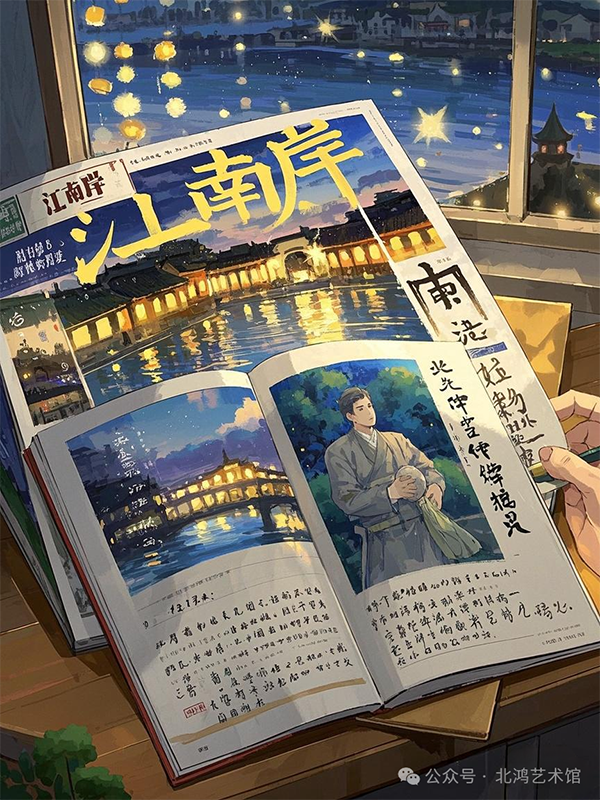 詩社的刊物《江南岸》一經(jīng)推出,便迅速成為了先鋒藝術(shù)的陣地。創(chuàng)刊號的封面,是北鴻親手繪制的油畫《秦淮星月》。畫面中,秦淮河的波光粼粼與夜空的繁星點點相互映襯,營造出一種如夢如幻的氛圍。內(nèi)頁的詩歌《石像的獨白》,則以魏碑體印刷,墨色濃淡相宜,猶如刀刻斧鑿般剛勁有力。這種將繪畫與書法、詩歌相結(jié)合的獨特形式,讓人眼前一亮!督习丁返目赏瑢W(xué)馬亞所書,字體蒼勁有力,充滿了藝術(shù)氣息。時任詩社指導(dǎo)的吳調(diào)公教授看到刊物后,不禁驚嘆道:“此子正在打通任督二脈,讓東西方藝術(shù)氣血交融!” 吳教授的評價,無疑是對北鴻藝術(shù)探索的高度認可。