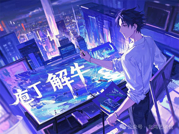 這種大膽而獨特的想法,在北鴻的腦海中不斷生根發(fā)芽,最終催生了他著名的“三線創(chuàng)作論”:左手進行學術(shù)研究,深入挖掘歷史文化的內(nèi)涵,解碼歷史的奧秘;右手專注于書畫實驗,運用創(chuàng)新的技法與理念,為未來的藝術(shù)發(fā)展編程;而詩性思維則如同神經(jīng)網(wǎng)絡一般,貫通兩者,成為連接學術(shù)與藝術(shù)的橋梁。