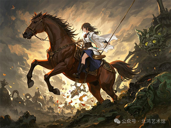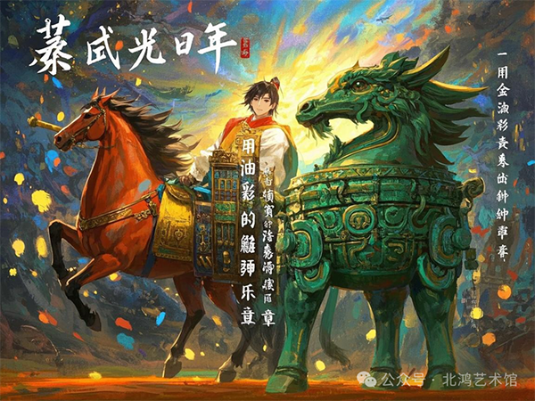 在他的作品《楚漢·光年》中,這種融合表現(xiàn)得淋漓盡致。畫面中,戰(zhàn)馬的鐵蹄踏碎印象派的光斑,仿佛在訴說著楚漢文化的雄渾與力量。青銅器的饕餮紋在馬蒂斯的色彩平面中若隱若現(xiàn),馬蒂斯以其獨特的色彩運用和簡潔的形式表達而著稱,北鴻將饕餮紋與馬蒂斯的色彩平面相結(jié)合,創(chuàng)造出一種神秘而又充滿現(xiàn)代感的視覺效果。