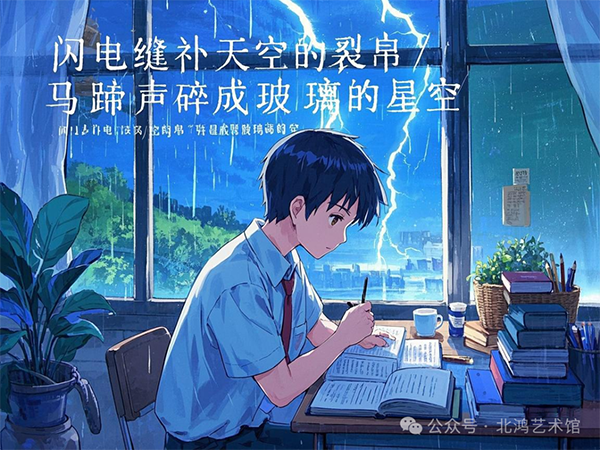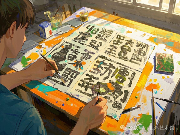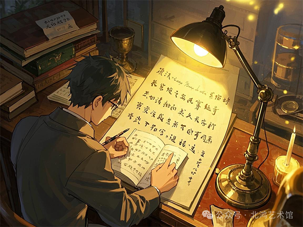 深夜,萬籟俱寂,北鴻卻仍在書案前忙碌。魏碑拓片散發(fā)著古老的金石之氣,而波德萊爾的詩句則在臺燈下跳躍,東西方文化在這一刻相互碰撞、交融。他沉浸在這種獨特的氛圍中,不斷汲取著創(chuàng)作的靈感。