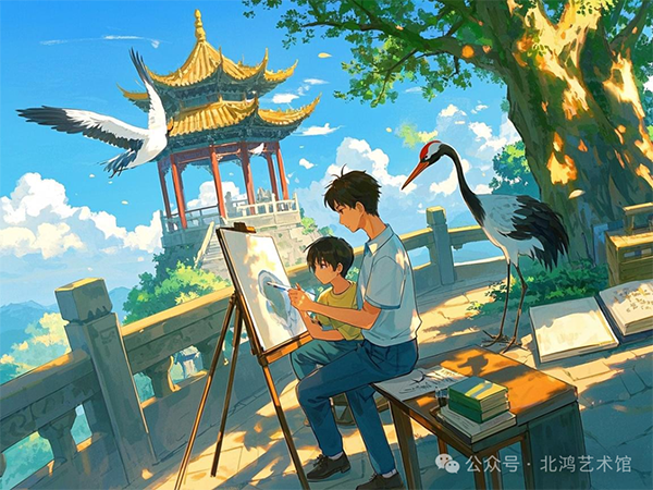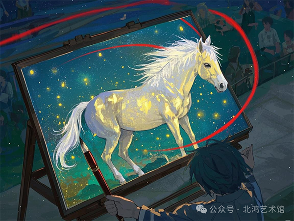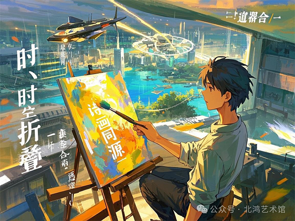 時空折疊體現(xiàn)了北鴻對傳統(tǒng)時空觀念的突破,他將不同時空的元素融合在同一畫面中,創(chuàng)造出一種獨特的藝術(shù)時空;詩畫同源強調(diào)了詩歌與繪畫之間的緊密聯(lián)系,他認為詩歌與繪畫可以相互轉(zhuǎn)化,共同表達藝術(shù)家的情感與思想;道器合一則體現(xiàn)了他對哲學與藝術(shù)關(guān)系的深刻理解,他認為藝術(shù)不僅僅是形式的表現(xiàn),更是對宇宙萬物之道的一種探索與表達。