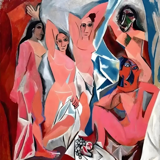 1.1.畢加索的立體主義:通過碎裂、解析與重組,將物體分解為多維度幾何塊面,如《亞威農(nóng)少女》中人物面部與身體的平面化處理,徹底顛覆傳統(tǒng)空間觀念。