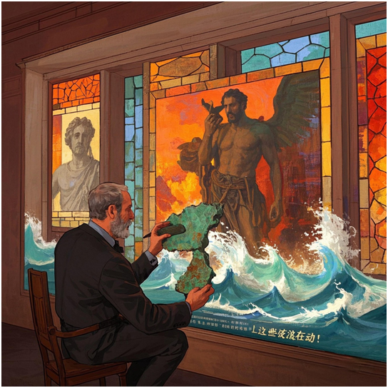 亞平寧半島的季風(fēng)裹挾著古羅馬銅銹氣息,撞進(jìn)十六世紀(jì)建造的圣喬治宮展廳。北鴻蹲在《海岳玄蹤》三聯(lián)畫前,輕輕刮擦畫中怒濤的肌理。地中海陽光穿過彩繪玻璃,在畫布上投下血珀色的光斑,策展人盧卡突然指著畫面驚呼:"上帝啊,這些波浪在動(dòng)!"