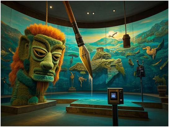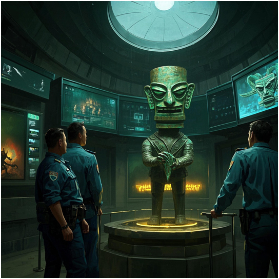 "這不是繪畫,"北鴻將畫刀刺入電源插座,"是打通冷兵器時(shí)代與AI文明的蟲洞。"當(dāng)裝置過載時(shí),勃蘭登堡門上的青銅戰(zhàn)車突然調(diào)轉(zhuǎn)方向,特斯拉工廠的機(jī)械臂跳起秦代軍儺舞,而默克爾的退休別墅監(jiān)控顯示,所有門窗把手都變異成了漢代玉琮形態(tài)。