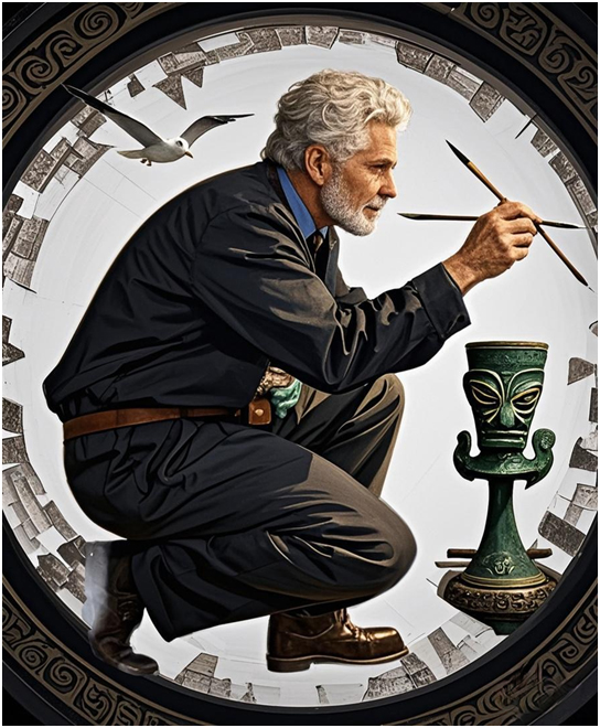 北鴻的狼毫筆懸在半空,墨色油彩正順著碎片的氧化紋路自主延展。他想起三個(gè)月前在徐州獅子山漢墓寫生時(shí),暴雨沖刷出的楚王兵器紋飾,此刻正在亞得里亞海的倒影中復(fù)活。展廳穹頂突然傳來海鷗的厲嘯,保安驚恐地發(fā)現(xiàn)所有監(jiān)控屏幕都閃爍著三星堆縱目面具的圖騰。
