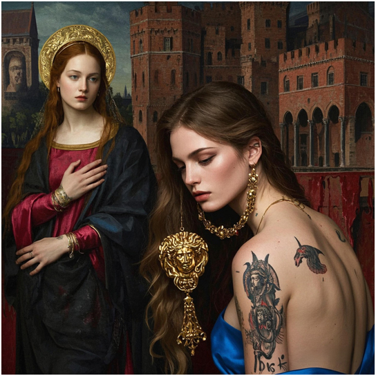 潮水漫過第三道石階時(shí)。水面頓時(shí)浮現(xiàn)出提香《烏爾比諾的維納斯》倒影,畫中貴婦的絲綢褶皺竟化作敦煌飛天飄帶。圣馬可大教堂的黃金祭壇突然自鳴,驚飛的白鴿群在夜空中拼出《洛神賦》。