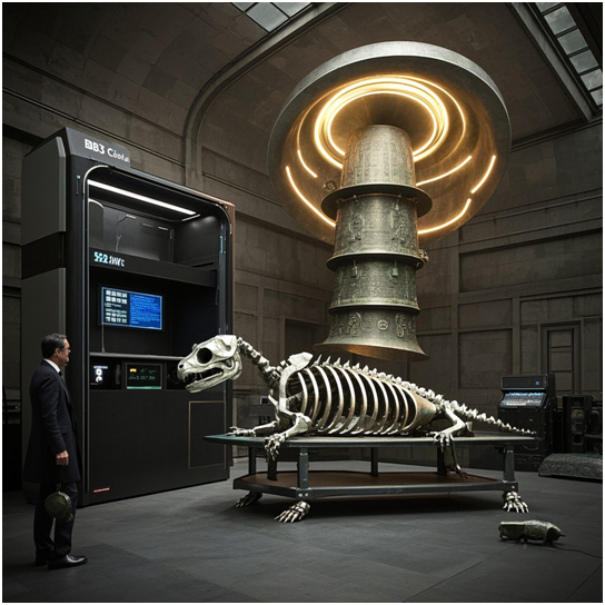 泰特現(xiàn)代美術(shù)館的渦輪大廳里,《颶風(fēng)》裝置正在扭曲時(shí)空。北鴻將徐州龜山漢墓甬道圖案比例輸入3D打印機(jī),輸出的鈦合金骨架竟自動(dòng)拼成曾侯乙編鐘的量子態(tài)模型。BBC現(xiàn)場(chǎng)直播時(shí),所有收音設(shè)備突然播放出楚王陵編磬的次聲波。