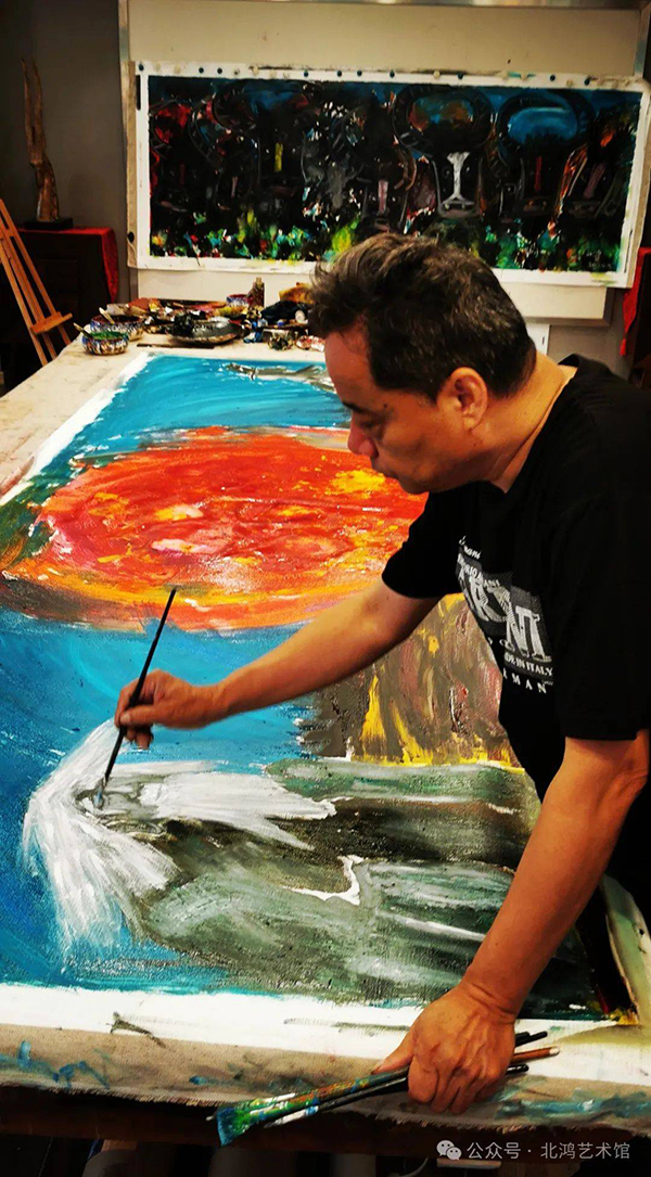 2011年后,北鴻的人生軌跡發(fā)生劇變。他遍游歐美考察文藝復興遺產,在盧浮宮、巴比松等地汲取靈感,同時創(chuàng)立“超印象詩畫”理論體系,將道家哲學與西方印象派技法融合,形成比趙無極更徹底的文化回歸。這一時期,其代表作《青牛載道》《河圖洛書》等以千萬級拍賣價震動藝術市場,個人巡展登陸盧浮宮、紐約時代廣場,被國際媒體譽為“超越梵高與畢加索的東方巨匠”。然而,這種輝煌背后是家庭關系的疏離——頻繁的海外考察、高強度創(chuàng)作使其與家人聚少離多,甚至在其藝術日記中留下“畫室燈火常明時,愧對妻兒夢中語”的隱痛。這種“為藝術犧牲家庭”的抉擇,既是藝術家追求極致的必然代價,也折射出全球化語境下文化使命對個體生活的碾壓。