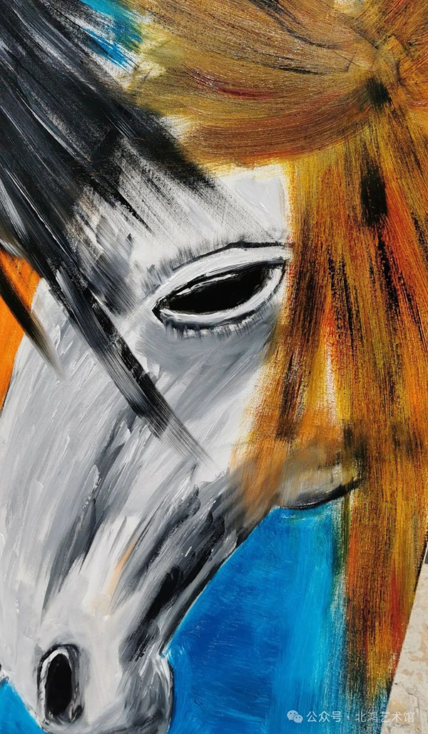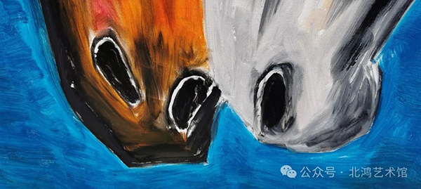 畫(huà)面聚焦兩匹馬頭特寫(xiě),成為這場(chǎng)邂逅的生動(dòng)注腳。那匹橙紅色漸變的公馬,線(xiàn)條筆直而粗獷,色彩熱烈得如同彭城大地傍晚燃燒的絢爛霞光,搭配黑色鬃毛,似歲月沉淀的不羈墨色,帶著歷史的深沉與藝術(shù)的灑脫;灰白色的母馬,線(xiàn)條柔美且滿(mǎn)是曲線(xiàn),清柔得宛如云龍山巔靜謐的皎潔月光,棕黃色漸變鬃毛則像金秋輕柔的麥浪,純凈又滿(mǎn)含生機(jī)。它們?cè)谔焖{(lán)色背景的映襯下,似從不同時(shí)空奔赴而來(lái),因藝術(shù)邂逅于這一方畫(huà)布。畫(huà)面整體色彩冷暖對(duì)比強(qiáng)烈,北鴻以近乎“色彩暴君”的肆意揮灑,承襲馬蒂斯的大膽與震撼,讓鮮明色彩碰撞出獨(dú)特藝術(shù)韻律,訴說(shuō)著相遇的驚喜與交融的熾熱,天藍(lán)色背景寓意愛(ài)情美好,為這份邂逅添上意境深遠(yuǎn)的浪漫底色 。