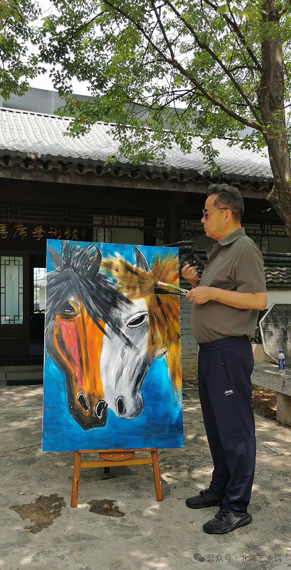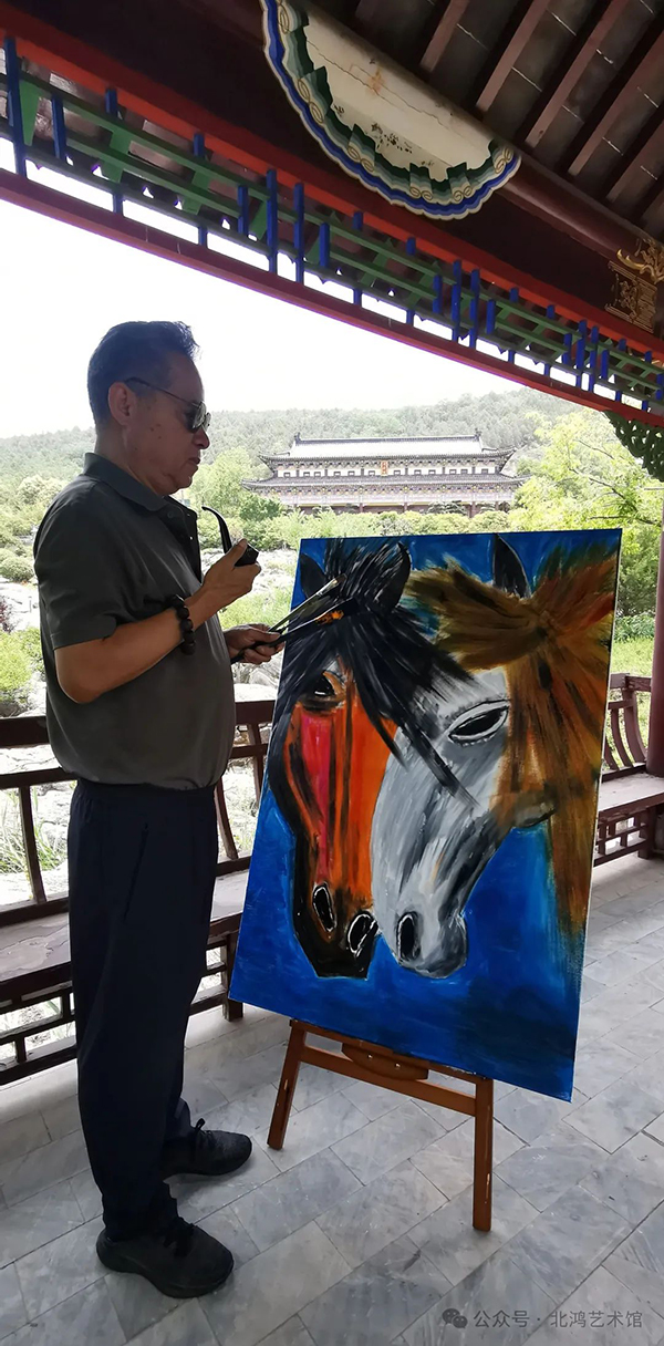 北鴻踏入張伯英藝術(shù)館,楚漢文脈的厚重與藝術(shù)傳承的溫度,化作創(chuàng)作靈感的星火。在這承載著彭城千年文脈的殿堂,藝術(shù)的邂逅悄然發(fā)生。北鴻以超印象詩(shī)畫(huà)風(fēng)格,將對(duì)藝術(shù)傳承的敬意與熱戀般的創(chuàng)作熱忱,注入《雙駿圖》的創(chuàng)作,讓古老文脈與現(xiàn)代藝術(shù)表達(dá)在此處碰撞、融合,開(kāi)啟一場(chǎng)屬于藝術(shù)的奇妙邂逅之旅。