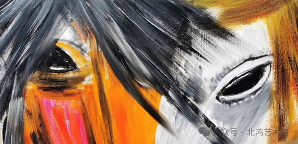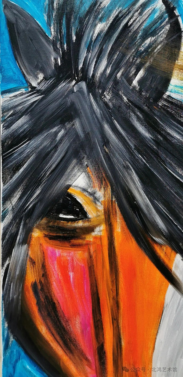 超印象詩(shī)畫(huà)風(fēng)格,為這場(chǎng)邂逅施加藝術(shù)魔法。北鴻以粗獷筆觸打破常規(guī)繪畫(huà)的細(xì)膩桎梏,那如“色彩暴君”般、有著馬蒂斯式肆意與震撼的色彩張力,讓色彩在自由揮灑中碰撞出獨(dú)特藝術(shù)韻律 。鮮明色彩對(duì)比不再是簡(jiǎn)單的視覺(jué)沖擊,而是成為傳遞邂逅情緒、熱戀氛圍的載體。藝術(shù)抽象表現(xiàn)手法,掙脫現(xiàn)實(shí)具象的束縛,使雙駿的形象超越馬的實(shí)體,成為藝術(shù)邂逅與熱戀情感的象征符號(hào),讓觀者在抽象與具象的邊界游走,沉浸式體驗(yàn)這場(chǎng)藝術(shù)邂逅帶來(lái)的心靈震撼與情感觸動(dòng)。