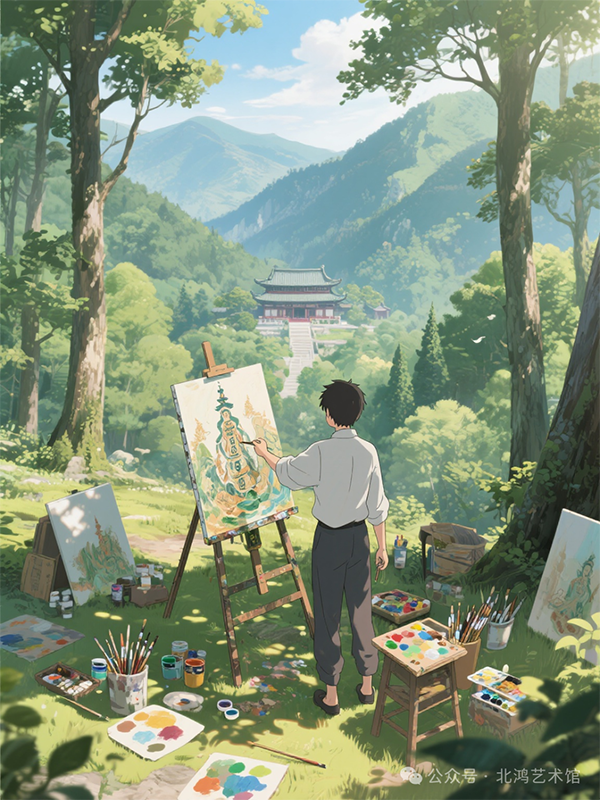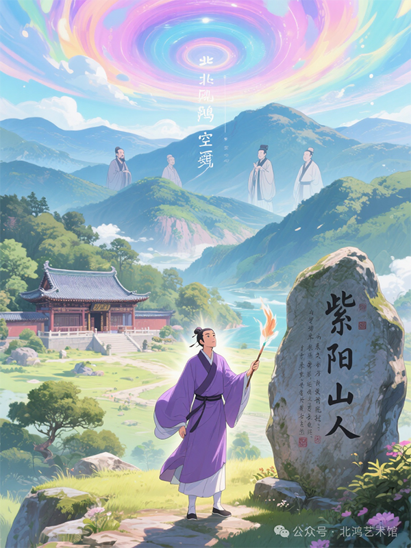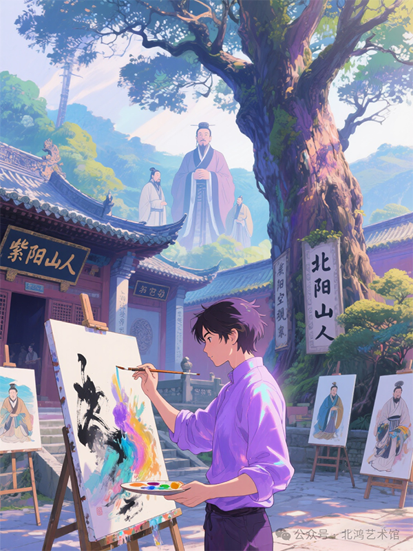 “紫陽山人”的號,實則是北鴻對文化符號的創(chuàng)造性重構(gòu)。地理層面,它錨定道教圣地的文化坐標;歷史層面,關聯(lián)朱熹等先賢的精神譜系;哲學層面,承載道家虛空觀的形上思考。三重內(nèi)涵的疊加,讓這一自號成為其藝術(shù)實踐的精神圖騰—— 以東方文化根脈為基底,用中西美學融合的技法為羽翼,踐行“東方文藝復興”的宏大愿景。當他在畫布上讓水墨與油彩共舞,使道家哲學與現(xiàn)代藝術(shù)對話,“紫陽山人”不再是個人的文化標識,而是東方藝術(shù)在全球化語境中發(fā)聲的精神符號,宣告著傳統(tǒng)文化基因在當代藝術(shù)創(chuàng)新中的覺醒與重生。