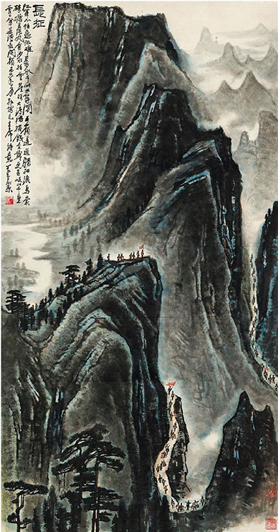 李可染過億元的5件作品,其題材全部為紅色經(jīng)典題材,第一件過億元的是1959年創(chuàng)作的《長征》,拍出1.075億元;第二件過億元的是1974年作《韶山革命圣地毛主席舊居》,拍出1.24億元;第三件過億元的是1964年作《萬山紅遍》,拍出2.9億元;第四件是1976年作的巨幅力作《井岡山》,拍出1.265億元;第五件是1964年所作《萬山紅遍》,拍出1.84億元。這5件作品都有故事。以《萬山紅遍》為例,這是李可染以毛澤東《沁園春·長沙》詞義為母題創(chuàng)作的紅色經(jīng)典畫作,其在1962年至1964年間共創(chuàng)作了7件同名作品,每件作品尺寸、章法和布景不一,但基本構(gòu)圖相同。目前,7件作品都已名花有主。而李可染創(chuàng)作的長征題材也是極受藏家歡迎,特別是第1件過億元作品《長征》,在2010年11月22日嘉德秋拍“長征——大師們的筆墨征途”專場中,經(jīng)過多輪激烈競投,最后以1.075億元人民幣成交,為當時近現(xiàn)代書畫成交價新紀錄。據(jù)悉,李可染此幅作品作于1959年,是為了紀念新中國成立10周年以毛主席詩詞進行的大型創(chuàng)作初稿,是新中國美術(shù)史中里程碑式的作品,也是李可染個人創(chuàng)作歷程中的重要代表作,畫面景物橫向展現(xiàn),重山疊積,如犬牙高低,參差錯落,雄奇壯麗。紅軍隊伍沿狹窄山路從左往右橫越畫面。畫家成功地將毛澤東詩詞中的革命豪情與浪漫色彩視覺化。畫中山體以濃墨重色寫成,塊面厚實穩(wěn)重,以留白形成的山路、水道穿插其間。從深濃墨色過渡到留白,色調(diào)的明暗變化,平衡了畫面厚重的體積感。全幅結(jié)構(gòu)規(guī)整,筆墨精嚴,氣象萬千,是一幀文學性、藝術(shù)性與時代意義結(jié)合的精品佳作。所以,該畫創(chuàng)出紀錄,實至名歸。記得不久前,在北京保利推出的李可染另一幅《長征》,獲價9856萬元,再創(chuàng)佳績。由此可見,李可染紅色題材作品十分受市場歡迎。