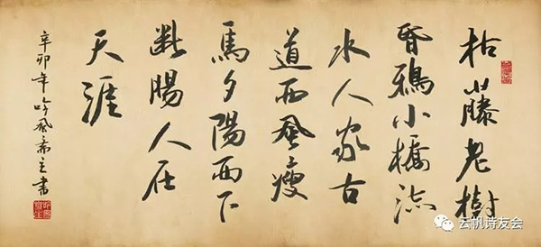 又有元代無(wú)名氏小令《醉中天》(見(jiàn)《樂(lè)府新聲》):“老樹(shù)懸藤掛,落日映殘霞。隱隱平林噪曉鴉。一帶山如畫(huà),懶設(shè)設(shè)鞭催瘦馬。夕陽(yáng)西下,竹籬茅舍人家。”也有六個(gè)意象與馬曲相同。