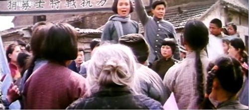 青年學(xué)生街頭宣傳抗戰(zhàn) ,街道上熙熙攘攘,士兵、民兵和民眾各自忙著自己的工作,報(bào)童叫喊著出賣報(bào)紙。廣告員身上掛著戲劇海報(bào)。婦女和兒童們?cè)谑袃?nèi)的兩個(gè)公園悠閑地散步和玩耍。穿著整齊的藍(lán)色制服的男女中學(xué)生散發(fā)著傳單。他們擎著第五戰(zhàn)區(qū)的旗幟。選自電影《血戰(zhàn)臺(tái)兒莊》