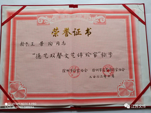 但人們是公正的,我的付出,我的辛勤勞苦,有情有義的文友們、徐州文學界的領導們看到了,記住了,我雖無心求名,而名譽自來:“德高望重”、“德藝雙馨”、“德才兼?zhèn)?rdquo;、“文好人更好”……等等溢美之辭,不斷從徐州市文聯(lián)、作家協(xié)會、評論家協(xié)會等各屆各級領導以及眾多作家作者口中筆下流出,給我極高的評價,極大的榮譽。“我有幸享受到特殊的厚愛:徐州市委宣傳部、徐州市文聯(lián)、作家協(xié)會、評論家協(xié)會先后破格專門為我舉辦了三次史無前例的會議:2004年4月20日,市文聯(lián)、作協(xié)、天能集團聯(lián)合召開了“王景陶文學創(chuàng)作報告會”。當時的徐州市文聯(lián)副主席、作協(xié)主席肖俊志、王建,作協(xié)副主席王善奎、鄭子、秘書長咎金龍等領導和作家、媒體、文學愛好者800多人出席會議,我作了《張開理想的雙翼翱翔于文學天地——我的文學創(chuàng)作之路》的報告。專門為一位作家召開文學報告會,這在徐州文壇史無前例,20多年來也再沒有人能獲此殊榮。2019年6月20日,徐州市作協(xié)又為我召開了“王景陶文學評論創(chuàng)作研討會”,市作協(xié)副主席、著名作家李繼玲費心盡力,親自操辦并主持,作協(xié)秘書長張毅菲等領導及三十多位作家參與研討,并有作家從北京等外地發(fā)來賀電和發(fā)言詞。為一位文學評論者專門召開研討會,在徐州也是第一次。著名書畫家褚衍民癌癥化療剛結束,就從醫(yī)院抱病直接來到會場發(fā)言并贈送墨寶“評論家風采”,之后月余即仙逝,此幅墨寶成了他的絕筆。工程學院人文學院副院長吳云教授為參加會議路上出了車禍。幸而只是車被剮人無恙……各級領導及以及眾多文友的熱情令我終生難忘。這次研討會的消息在新華社、中國新聞、百度、鳳凰、澎湃、中國作家網(wǎng)等30余家國內外網(wǎng)站發(fā)布,引發(fā)廣泛影響。有作家說:“王老師的名聲響遍全球了”。2022年10月4日,壬寅重陽佳節(jié)之際,市文聯(lián)、作協(xié)、評協(xié)又聯(lián)合在李可染藝術館為我隆重舉辦了“戰(zhàn)地黃花分外香—王景陶文藝評論四十年座談會”,各級領導、著名作家、評論家、教授、專家、學者30余人參加了會議。大家在會上給予我極高評價:江蘇省作協(xié)書記處書記、徐州市文藝評論家協(xié)會主席黃德志把我的文學評論風格概括為“真、情、義、美。”市文聯(lián)副主席沈士峰強調:“王景陶老師對徐州文學的貢獻,必將在徐州文學史上留下濃墨重彩的一筆!”市作協(xié)副主席楊洪軍評價我“是徐州文學的在場者和守望者。”著名作家、評論家張國志指出:“當我們在學習王景陶老師的時候,我們在學習什么?我們在學習責任、善意和真誠”。市作協(xié)副主席李繼玲在發(fā)言時動情地說:“王景陶老師多年以來以豐厚的學養(yǎng)以及廢寢忘食的一己之力,挑起了為徐州作家懸絲把脈、望聞問切的大梁。您以點評大家的作品為己任,大家以您點評為榮幸。王老師是徐州乃至當今中國文學圈里的一股清流,是我們的楷模。”著名小說家、紫金山文學獎獲得者李其珠感嘆“嘔心瀝血知是誰?鞠躬盡瘁景陶師”文學愛好者陳家強欽佩地說:“景陶老師是徐州文壇的構建者與靈魂”!女作家王芳則說:“王景陶老師是我輩做人的楷模、寫文的榜樣”。從文學上升到做人的高度,令我惶恐不安。會上市作協(xié)、評協(xié)聯(lián)合授予我“德藝雙馨文藝評論家”榮譽稱號,并當場頒發(fā)榮譽證書。市書法家協(xié)會兩位副主席景大文、耿廣敏敬贈“德藝雙馨”牌匾。此次會議,澎湃、百度、今日頭條、網(wǎng)易、鳳凰、新浪、中國作家等十余家網(wǎng)站均作報道,點擊閱讀量三十余萬人次,影響可謂深遠。為一位文藝評論家召開三次創(chuàng)作會議,并授予榮譽稱號,不僅在徐州,而且在全省、全國也是獨一無二、絕無僅有的。對此,著名作家、紫金山文學獎獲得者楊剛良指出:“(這些格局、影響、榮譽)前無古人,后無來者!景陶先生無人可以超越!”人們的贊譽既給了我公平的評價,也溫暖了我的人生,還影響著徐州文壇眾多的作家勇于承擔起作家的責任,向更高處攀登!而這正是我的心愿。
