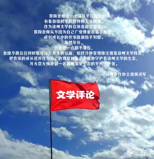 徐州作家中著名的伯樂,發(fā)現(xiàn)并扶持了孫友田、周梅森等著名作家的資深報紙編輯袁慶南老師在《序》中寫道:“景陶成為徐州文評之驍將、廣大讀者之良師、作家作者之益友,此徐州之幸也!……景陶之為人也,誠樸仁善,溫和敦厚,儒雅自謙,真君子也;景陶之為文也,自出機杼,辭約旨永,知博理深,乃佳作也;景陶之作評也,夸而有節(jié),摘瑕中的;景陶之作論也,析薪破理,精微朗暢。景陶實是腹有詩書,筆生妍花。由是,景陶之文學評論自成一家之言,獨顯一家風骨,不愧為徐州文苑評論萬花中之奇葩。”
