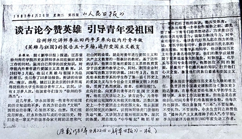 翻閱李先生此書,讓我不禁想起當(dāng)年他奔走四方為各界群眾演講的情景。中國文人歷來有周游四方、傳經(jīng)布道的傳統(tǒng)。上世紀(jì)八十年代初,隨著國門大開,西風(fēng)東漸,傳統(tǒng)的價(jià)值觀、道德觀、愛國觀受到?jīng)_擊。一些先知先覺的大學(xué)教師,以首都師范大學(xué)的李燕杰為代表,走出校園,四處演講,以青年為師,做青年之友,一時(shí)轟動(dòng)全國。當(dāng)時(shí)任教于徐州師范學(xué)院的李永田先生步其后塵,以《英雄與祖國》為題,演說于黃河上下,大江南北。由徐州電臺(tái)錄制的演講錄音,經(jīng)江蘇電臺(tái)首播之后,在全國29個(gè)省、市、區(qū)電臺(tái)播出。李先生遂有“江蘇李燕杰”之稱。1983年4月26日的《人民日?qǐng)?bào)》曾在四版頭條位置,以《談古論今贊英雄 引導(dǎo)青年愛祖國》為題報(bào)道李先生的事跡。1991年李先生奉調(diào)進(jìn)京后,筆者與他多年未再聯(lián)系,但從新聞報(bào)道中知悉他在完成研究工作之余,一直未中斷“神州播愛”的公益活動(dòng)。此書的每個(gè)篇章,恰似一段段精彩的演講,詩人的激情,哲人的思考,史家的目光,為師者的愛心,熔于一爐,讓你聽而增識(shí),聽而益智,聽而向善。還是那句老話:開卷有益。倘若有此書在手讀一讀,當(dāng)是一件大有益于身心健康的好事。感興趣者,不妨試試。