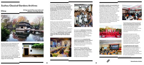 蘇州園林參展案例以“蘇州園林檔案——遺產(chǎn)園林保護(hù)利用的生動(dòng)記錄”為主題,通過(guò)蘇州市園林檔案館和九座遺產(chǎn)園林的圖文,以“記憶的容器”“煥新的活力”“世界的回響”“未來(lái)的種子”四個(gè)篇章介紹檔案是連接遺產(chǎn)園林與世界的橋梁,分享蘇州古典園林在遺產(chǎn)價(jià)值闡釋、系統(tǒng)性保護(hù)與統(tǒng)一監(jiān)管、園事花事活動(dòng)、園林活化利用、國(guó)際交流展示、海外姐妹園締結(jié)、青少年世界遺產(chǎn)教育、數(shù)字化應(yīng)用等方面的“蘇州經(jīng)驗(yàn)”,展現(xiàn)深厚的文化遺產(chǎn)記憶。