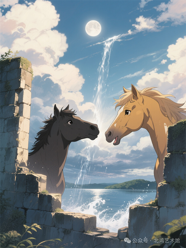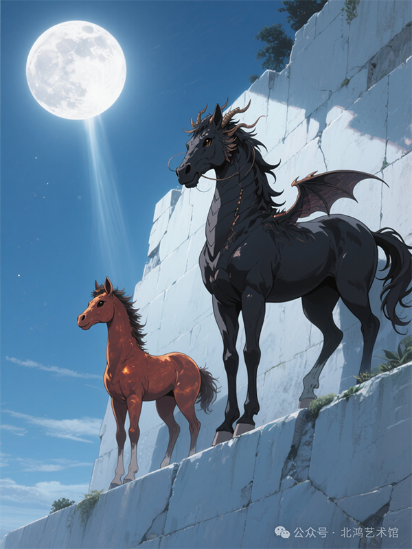 云層開闔,月光如天河決堤傾瀉而下。斷墻上,幼駒粗礪的墨眼與新馬熔金鑄就的雙目,在千年不易的清輝中交匯、熔鑄。此刻一聲清越的野馬嘶鳴陡然穿透四野沉靜,自遠(yuǎn)處云龍湖澤畔如浪涌來——聲入九霄,仿佛舊魂穿新骨,踏遍銀霜而去。