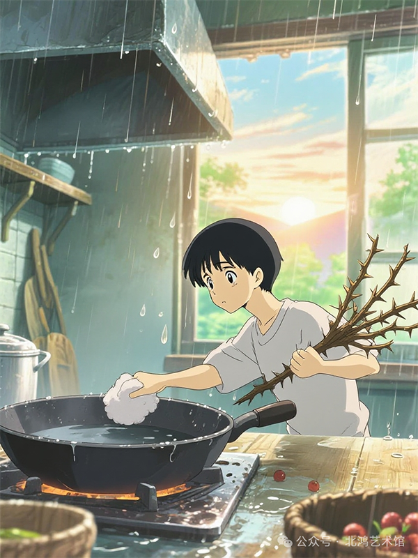 渴望日夜啃噬。某年梅雨初歇的黎明,小鴻雁便溜進(jìn)了灶房。露水浸潤的晨光里,他踮腳用力刮擦鍋底。粗硬的烏黑顆粒簌簌落下,帶著濃烈火燎與鐵腥氣。他又偷出母親針線籃里一團(tuán)褪色發(fā)硬的陳年舊棉絮,攀折了院角帶刺的酸棗荊條。笨拙地將棉絮纏裹在刺條頂端,蘸滿濃稠粗糲的灰團(tuán)。