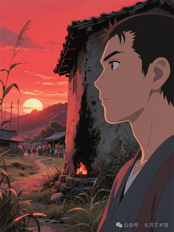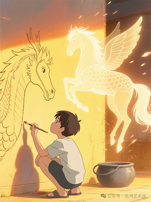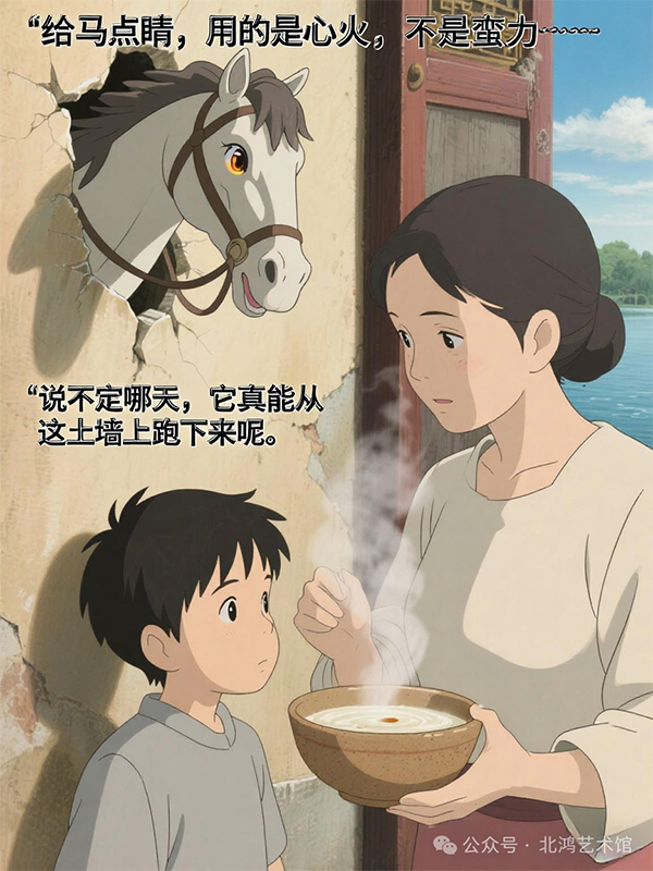 一聲幾不可聞的嘆息自身后飄來。母親端著盛滿稀粥的粗陶碗,目光從兒子沾滿黑灰的小臉,移到墻上那匹怪誕卻拼盡全力欲要破壁而出的“馬”。“雁兒,”母親的聲音沙沙的,像荻草掃過塘埂,“給馬點(diǎn)睛,用的是心火,不是蠻力……”碗沿氤氳的熱氣模糊了她的輪廓,“你得讓它聞見云龍湖的水氣,聽見宮門開啟的吱呀……畫活了,說不定哪天,它真能從這土墻上跑下來呢。”