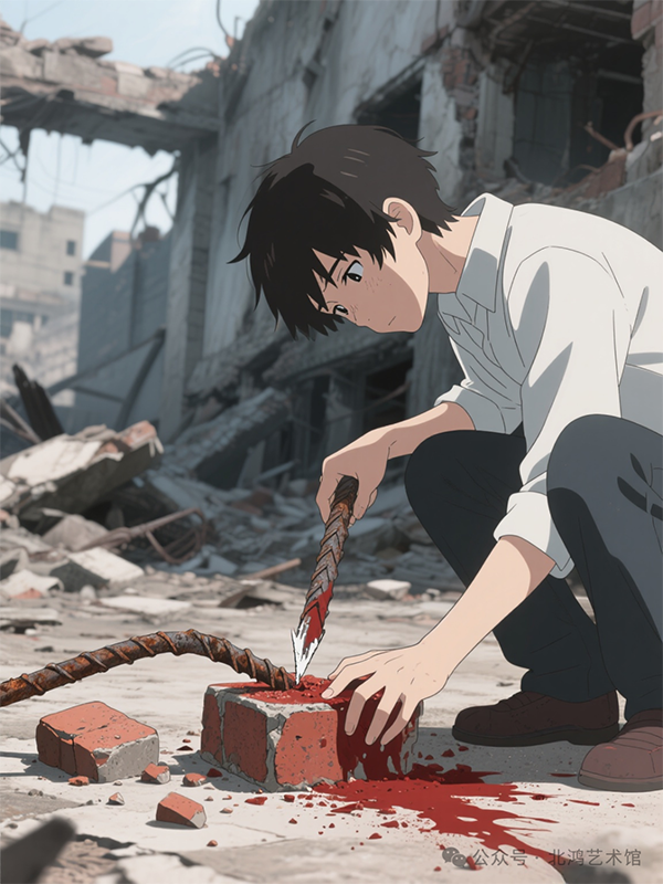 北鴻佇立的身體微微一震。許久,他緩緩彎下腰,拾起廢墟中一根扭曲銹蝕的鋼筋,又蹲下身,在地上尋到半塊飽經(jīng)風(fēng)霜而棱角分明的紅磚碎塊。鋼筋尖利的斷茬在紅磚棱角上反復(fù)刮擦、研磨,赭紅色的石粉如細(xì)碎的赤血滾落掌心。