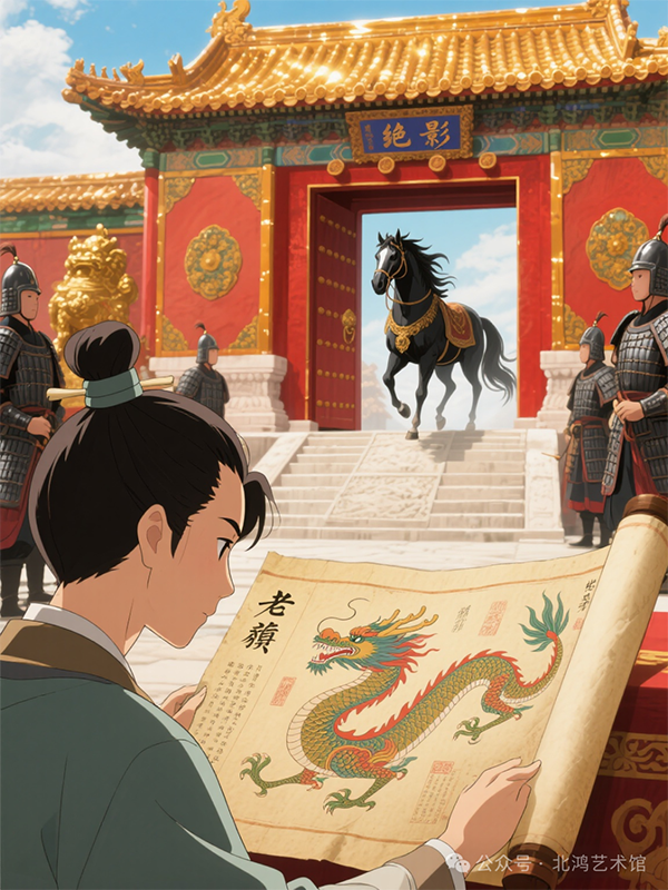 那匹名為“絕影”的龍駒入京盛況被銘刻在老族譜發(fā)黃的棉紙上。每逢祭祀,張鴻雁總凝神于那幅泛彩手繪貢圖:朱砂染就的宮門次第洞開,琉璃瓦折射驕陽,龍駒昂首步過玉墀,足下纖塵不染,烏銀鬃毛拂過之處,御前侍衛(wèi)的玄甲折射的金光仿佛都被吸噬。那匹似龍似馬的存在,成了嵌在他心壁深處的活圖騰。