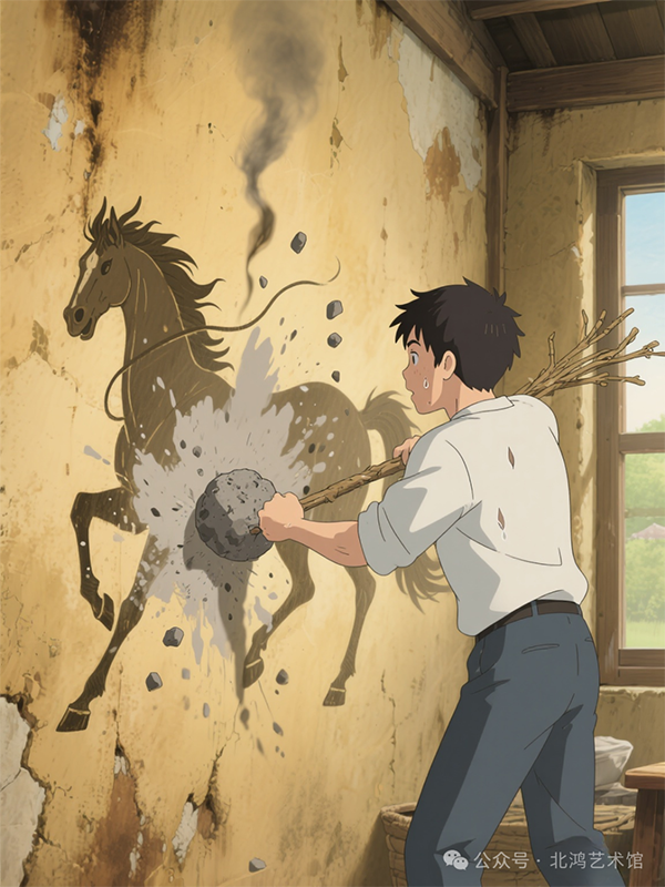 他轉(zhuǎn)身,面對(duì)那堵風(fēng)雨不能摧垮的老墻。鋼筋代替了童年的荊條,掌中溫?zé)岬聂骷t磚粉取代了冰冷粗糲的鍋灰。就在那匹由童稚熱望掙扎而生的粗黑龍駒之側(cè),他手腕沉穩(wěn)揮動(dòng)!鋼筋飽蘸細(xì)紅粉末,帶著近乎金石相擊的冷峻筆鋒掃過墻面!這新生的龍駒不再依賴于幻覺的輪廓,每一筆筋骨都以磚粉的力量勾勒——鐵蹄踏碎塵障,怒揚(yáng)的頸項(xiàng)撕裂凝滯的空氣,鋼筋掃出的鬃毛仿佛在暮氣中獵獵燃燒,炸裂出金屬的飛白!最懾魂處,是那巨目——北鴻以生滿厚繭的指腹狠狠摁壓磚粉,將其碾入童年所點(diǎn)“舊眼”旁新掘的凹陷深處,一層一層,堆積如巖漿,沉淀似金石。指力所至,土屑簌簌而下。