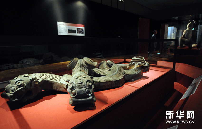 (5)10月9日,在日本東京國(guó)立博物館舉行的《中國(guó)王朝至寶展》媒體預(yù)展上,觀眾觀看戰(zhàn)國(guó)時(shí)代秦國(guó)的龍雕塑。