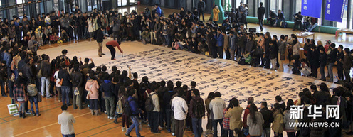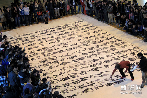 新華網(wǎng)杭州11月18日電 當(dāng)日,“書(shū)法道——王冬齡書(shū)法現(xiàn)場(chǎng)”活動(dòng)在位于杭州的中國(guó)美術(shù)學(xué)院象山校區(qū)體育館舉行。王冬齡在6.6米乘15米的巨幅宣紙上書(shū)寫(xiě)《蘭亭集序》。這是王冬齡為學(xué)校1000多名大一新生進(jìn)行的一場(chǎng)現(xiàn)場(chǎng)教學(xué),他希望以這種方式讓新生了解中國(guó)傳統(tǒng)文化的精髓。