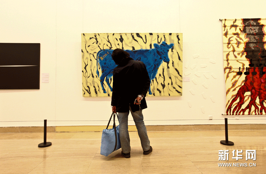 (2)11月20日,在中國(guó)美術(shù)館,一位參觀者在欣賞委內(nèi)瑞拉畫(huà)家薩穆埃爾·巴羅尼的作品《母牛》。